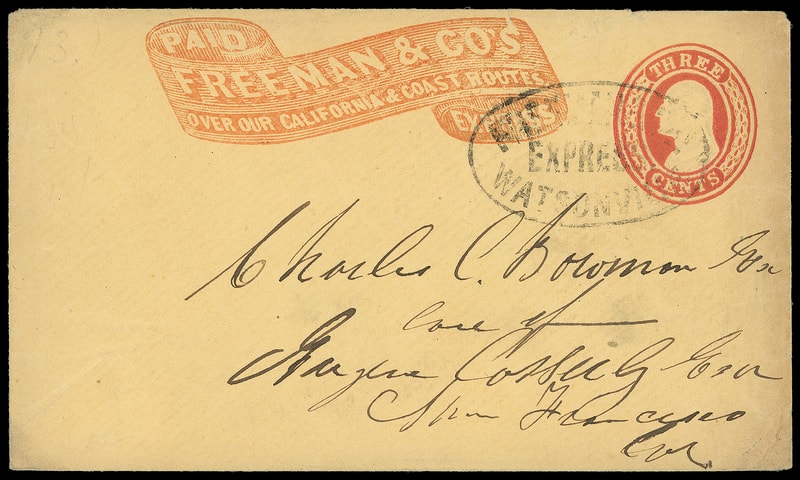 Freeman & Co's Express, Watsonville, oval company handstamp cancels 3¢ red (U10) buff Nesbitt entire with red "Paid, Freeman & Co's Express" frank to San Francisco Cal.; some edge wear, F.-V.F.