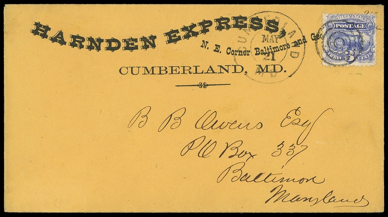 Harnden Express, Cumberland, Md., fancy corner card on orange cover bearing 3¢ ultramarine (114) tied by four-ring target duplexed with "Cumberland, Md. May 21" double-circle datestamp to Baltimore Md., Extremely Fine and choice, the only recorded example .