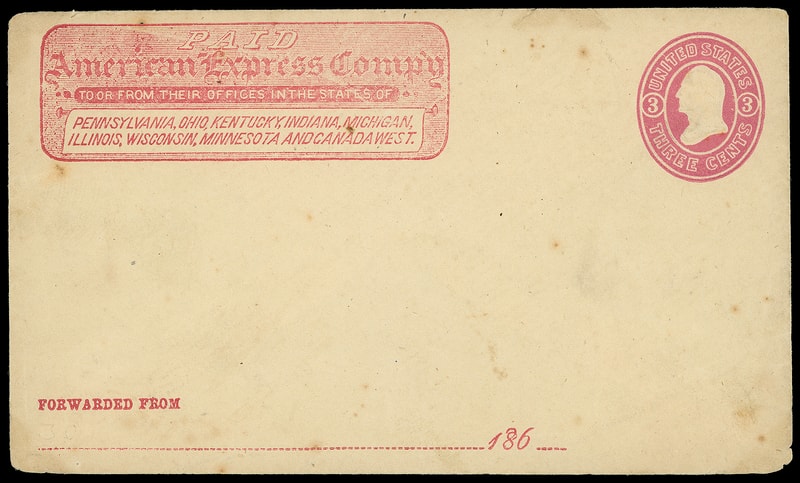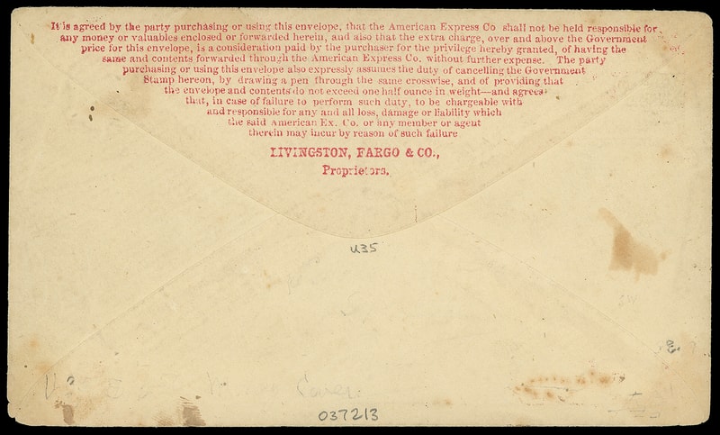 American Express Company, red printed frank on 3¢ pink (U34) entire, flap with printed warranty of service by Livingston, Fargo & Co.; wear, F.-V.F.