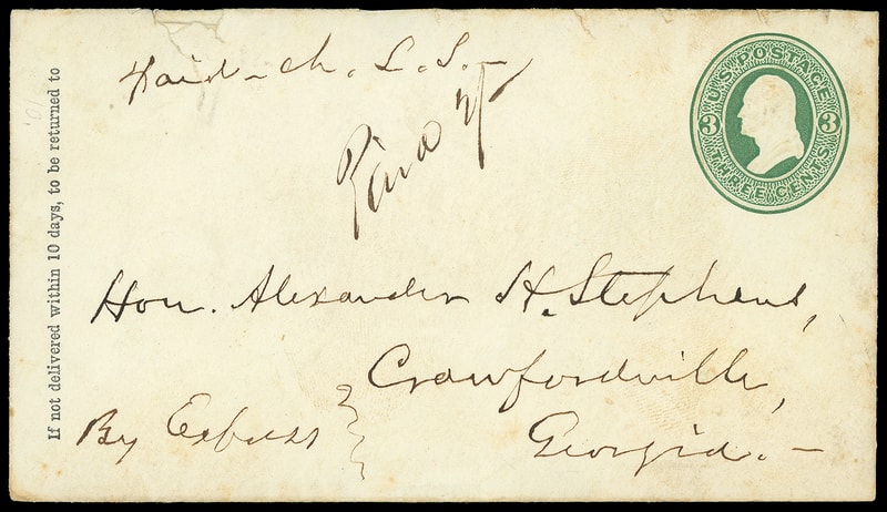 Southern Express Company, Sparta, Ga. M. & A. R.R., black on orange label affixed to reverse of 3¢ green (U82) entire to Hon. Alexander H. Stephens, Crawfordville Ga. endorsed " By Express ", ms. " Paid 2/- " express rating, pencil "2nd Sep 1871" docketing on reverse; small opening tear and small bit of flap missing, F.-V.F.
