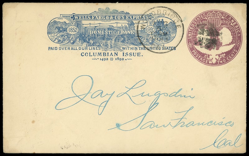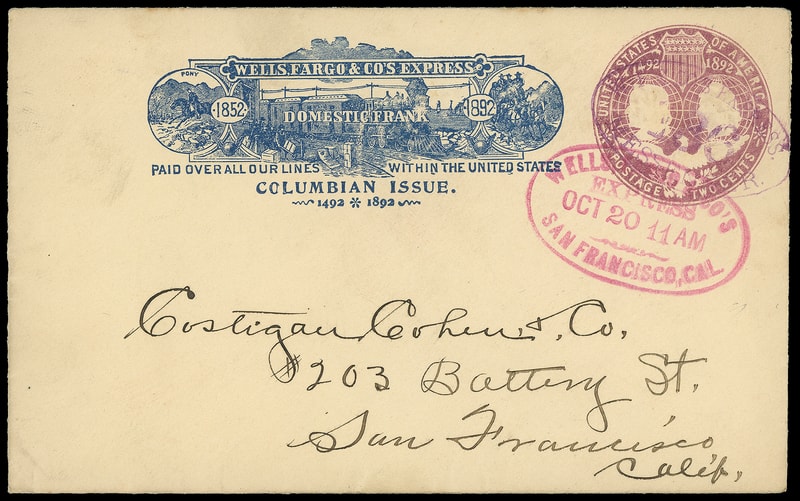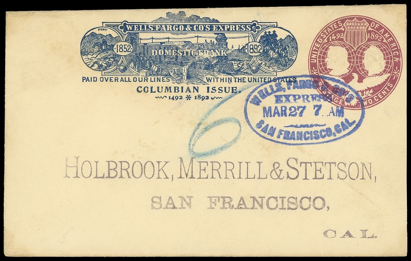 Wells, Fargo & Co's Express, San Francisco, Cal, Mar 27, intense blue oval cancels 2¢ Columbian (U349) entire with blue 1892 Wells Fargo Columbian frank to San Francisco Cal., blue crayon "6"; reduced slightly at right, Extremely Fine gem use.
