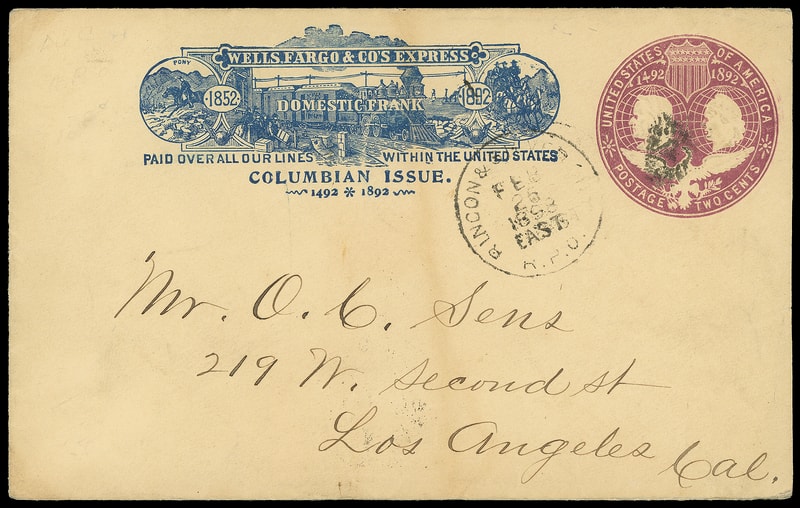 Wells, Fargo & Co's Express, San Francisco, Cal. Aug 28, purple oval on 2¢ Columbian (U349) entire with blue Wells Fargo 1892 Columbian Issue frank canceled by blue "So. Pac. Co., Cornwall, Aug 28" double-circle datestamp, blue "Holbrook, Merrill & Stetson, S.F., Aug 2, 1893" double-oval backstamp, Very Fine.