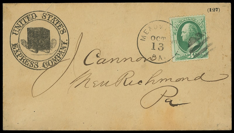 United States Express Company, illustrated corner card on brown cover bearing 3¢ green (147) tied by "Meaville Pa. Oct 13" duplex to New Richmond Pa.; small edge tear, F.-V.F.