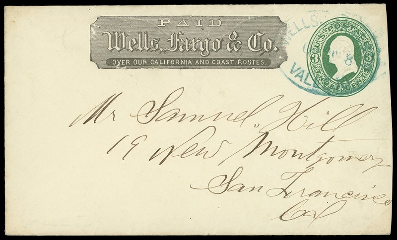 Wells Fargo & Co., Vallejo, Oct 8, blue oval datestamp cancels 3¢ green entire with printed "Wells, Fargo & Co." frank to San Francisco Cal.; reduced at right, F.-V.F.