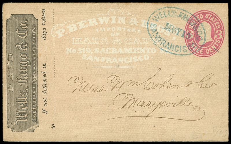 Wells, Fargo & Co., San Francisco, May 15, blue oval datestamp cancels 3¢ pink (U59) buff entire with orange "P. Berwin & Bros., Importers of Hats & Caps, San Francisco" shaded ad and printed "Wells, Fargo & Co." frank at left to San Francisco Cal.; reduced slightly at right, Very Fine and attractive.