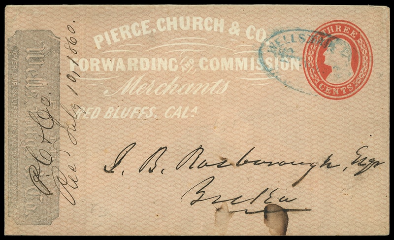 Wells, Fargo & Co. Express, Red Bluffs, Cal., blue oval cancels 3¢ red (U9) Nesbitt entire with overall red "Pierce, Church & Co. Forwarding and Commission Merchants, Red Bluffs, Cala. " shaded ad and Wells Fargo & Co. printed frank addressed to Joseph B. Rosborough, "July 10, 1860" docketing at left, Very Fine and attractive.