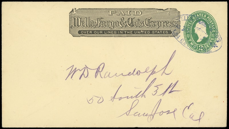 Wells, Fargo & Co.'s Express, Los Gatos, Cal., blue oval handstamp (Leutzinger type 10-18) on 1887 2¢ green entire with black printed Wells Fargo frank to San Jose Cal., Very Fine.