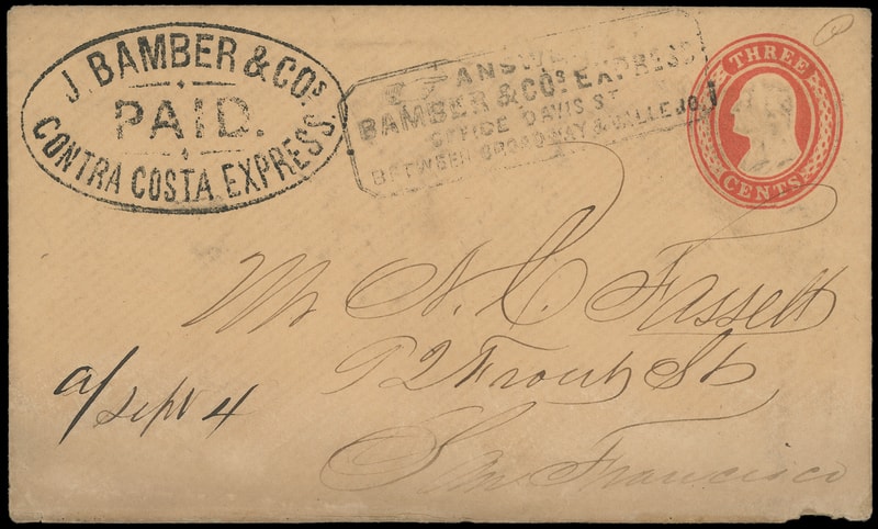 Bamber & Co's Express, S.F., Nov 1, red double-circle datestamp cancels 3¢ pink (U59) buff entire with printed "Bamber & Co's Express" frank to San Francisco Cal.; couple tone spots, F.-V.F.