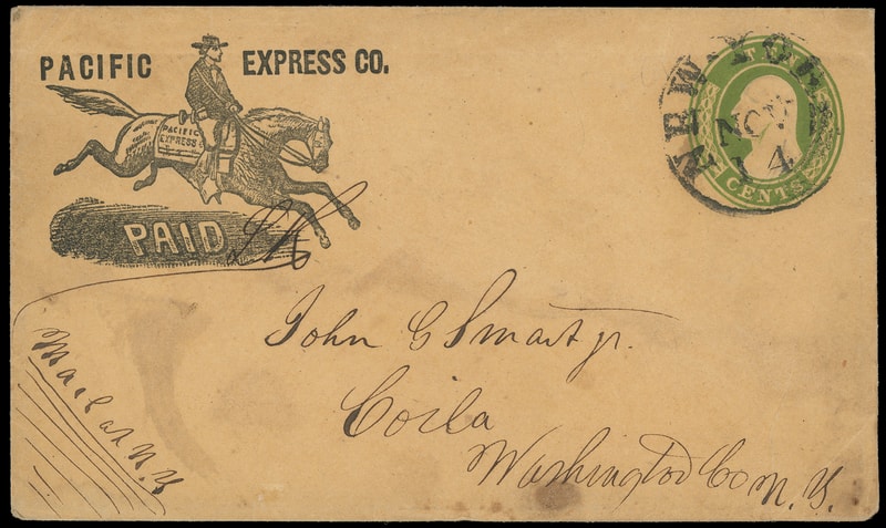 Pacific Express Co. Paid., printed Horse and Rider frank with manuscript " LR " initials of Levi Robie on 10¢ green (U18) buff Nesbitt entire to Coila N.Y., endorsed "Mail at N.Y." at lower left, postmarked in transit "New York, Nov 14" cds; light tone spots, still a Very Fine and rare use, ex-Knapp .