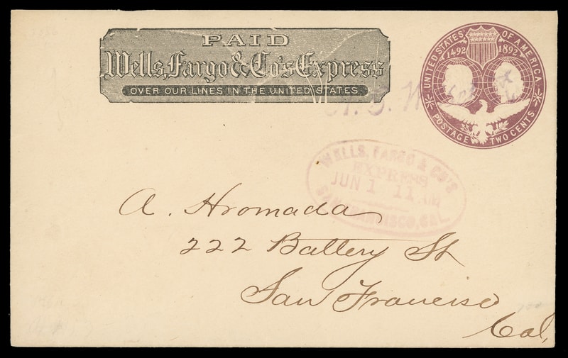 Wells, Fargo & Co's Express, San Francisco, Cal. Jun 1, purple oval datestamp on 2¢ Columbian (U349) entire with printed "Wells, Fargo & Co." frank and canceled by violet "H.G. Willet" agent straightline to San Francisco Cal.; bit of flap missing, Very Fine, ex-Tatham .