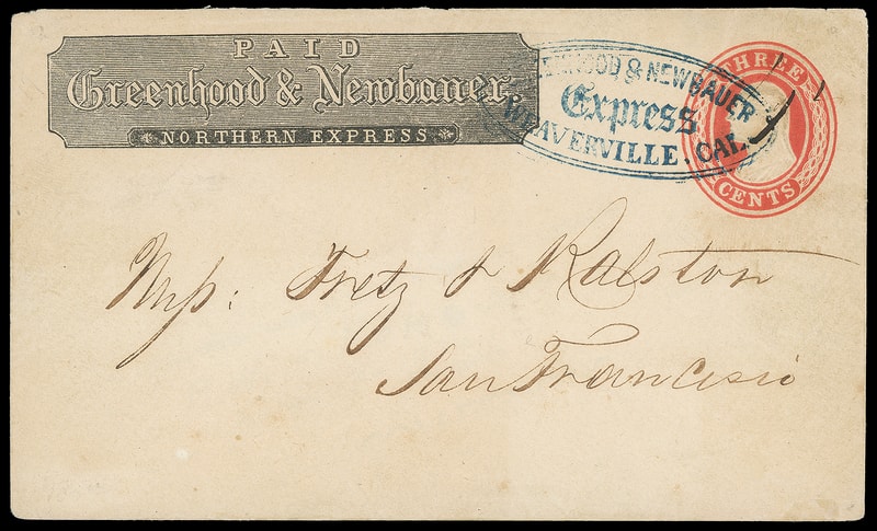 Greenhood & Newbauer Express / Weaverville, Cal., blue company oval on 3¢ red (U10) buff entire to San Francisco Cal. with Greenhood & Newbauer, Northern Express printed frank, fresh and Very Fine.
