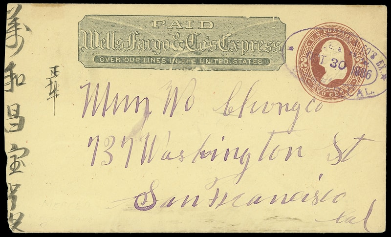Wells, Fargo & Co's Ex., C. A. Es. Agt., Merced, Cal. Oct 30, 1886, purple double-oval datestamp on 3¢ red brown on amber entire with printed "Wells Fargo & Co." printed frank to San Francisco Cal., Chinese directional lettering at left; reduced at left, F.-V.F., a scarce agent oval.
