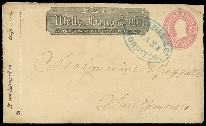 Wells, Fargo & co., Hornitos, Jan 4, bold blue oval datestamp on 3¢ pink (U59) buff entire with printed "Wells Fargo & Co." frank to San Francisco Cal.; top right corner mend, F.-V.F.
