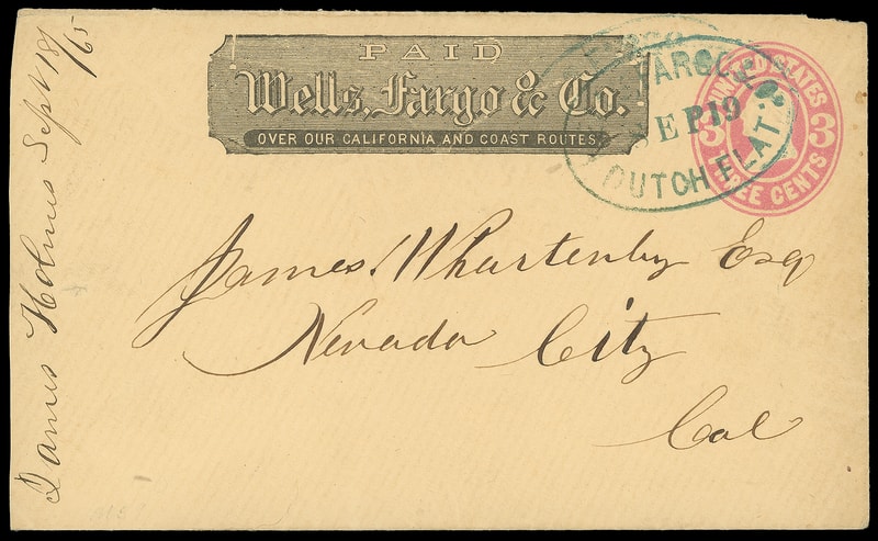 Wells, Fargo & Co. Dutch Flat, Sep 19, blue oval cancels 3¢ pink (U59) buff entire with printed "Wells, Fargo & Co." frank to Nevada City Cal., ms. "James Holmes Sept 18/65" docketing at left; reduced slightly at left, F.-V.F.
