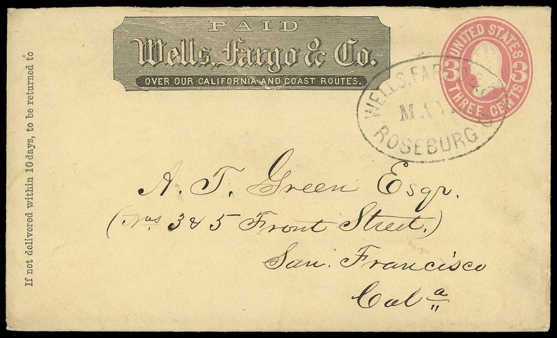 Wells, Fargo & Co., Roseburg O., May _ (Oregon), sharp oval datestamp cancels 3¢ pink (U59) buff entire with printed "Wells, Fargo & Co." frank to San Francisco Cal., May 23, 1869 company receiving backstamp, Very Fine.