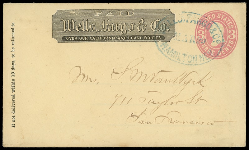 Wells, Fargo & Co., Hamilton Nev. Mar 29, blue oval datestamp cancels 3¢ pink (U59) buff entire with printed "Wells, Fargo & Co." frank to San Francisco Cal., Very Fine.