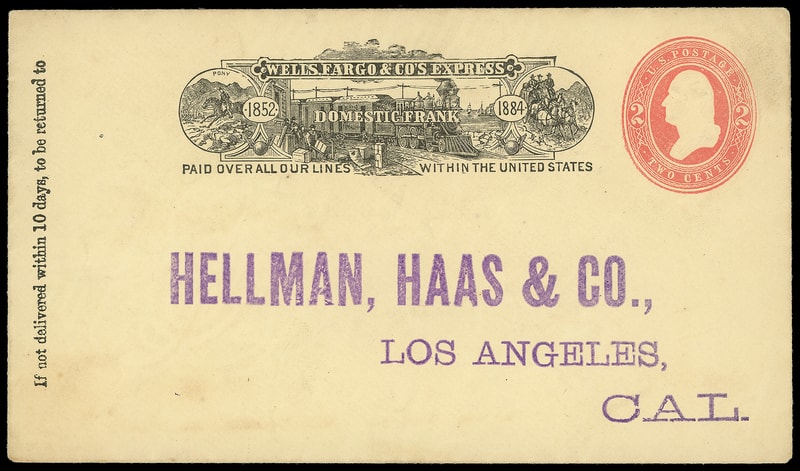 Wells, Fargo & Co., Los Angeles, Jun 17, bold blue oval cancels 3¢ pink (U59) buff entire with printed "Wells, Fargo & Co." frank to Santa Barbara Cal.; partial bottom flap with couple tiny edge tears, Very Fine.