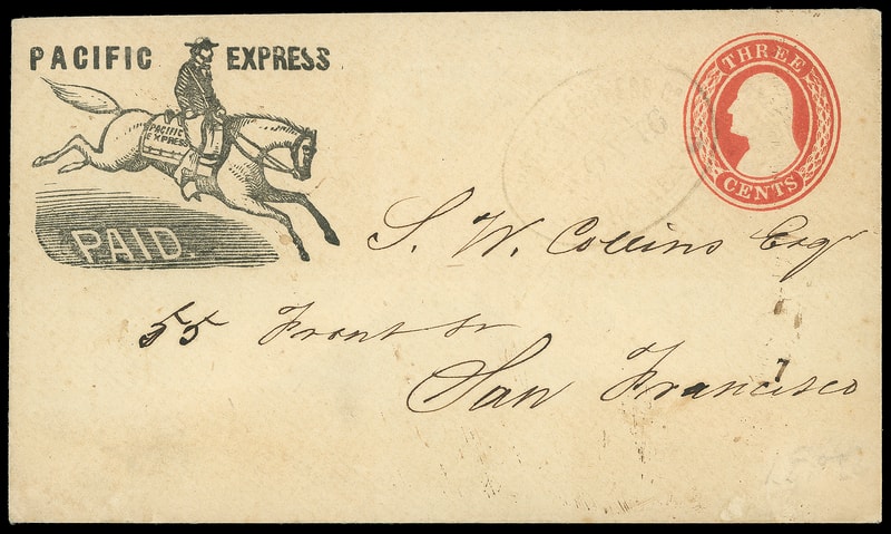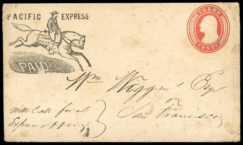 Pacific Express, Paid, running pony printed frank on 3¢ red (U1) Nesbitt entire to San Francisco Cal. endorsed "Will call for at Express Office"; some wear and soiling, F.-V.F.
