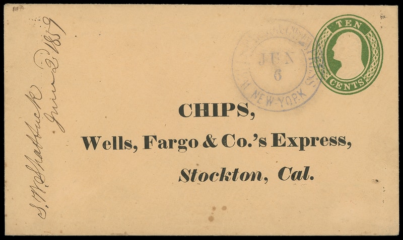 Wells, Fargo & Co's Express, New York, Jun 6, ultramarine double-circle cancels 10¢ green (U16) buff Nesbitt entire with preprinted address to Chips, Wells Fargo & Co.'s Express, Stockton, Cal., neatly docketed "S.W. Shattuck, June 2d 1859" at left, Very Fine, ex-Kramer .
