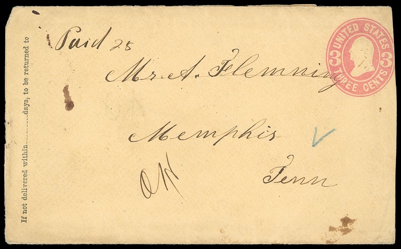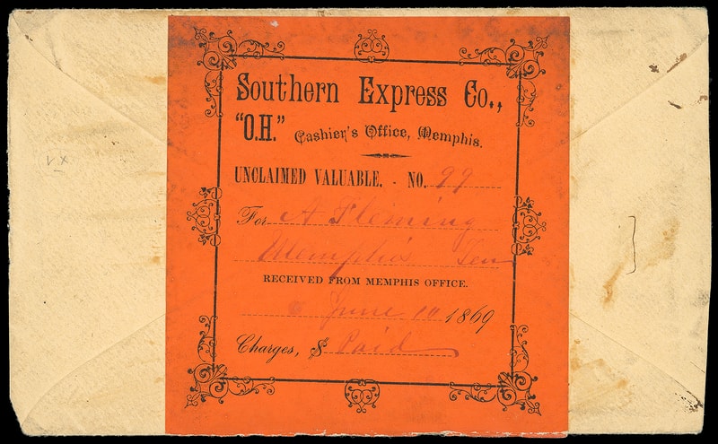 Southern Express Co., "O.H.", Unclaimed Valuable, Memphis Tenn., red on orange June 10, 1869 label affixed on reverse of 3¢ pink (U59) buff entire from Washington, Georgia with " Paid 25 " express rating to Memphis, Tenn., original letter datelined "Washington Ga March the 9 1867" between brothers; small flaws and reduced at right, Fine and unusual unclaimed post-war express use.