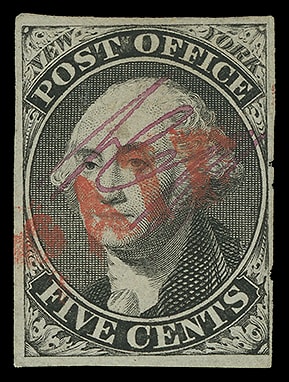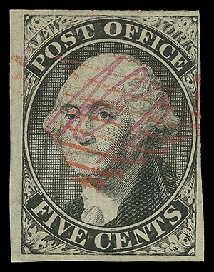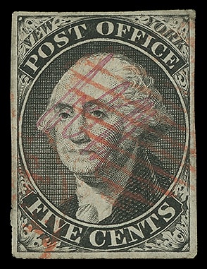 New York, N.Y., 1846, 5¢ black on bluish, signed "ACM" connected, large to huge margins except clear upper right, neat red square grid cancel, small tear at right, F.-V.F. appearance.