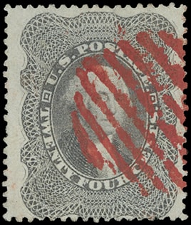 1860, 24¢ gray lilac, wide margins, touched at bottom, exceptional red grid cancel, neat impression on fresh paper, Very Fine and striking.