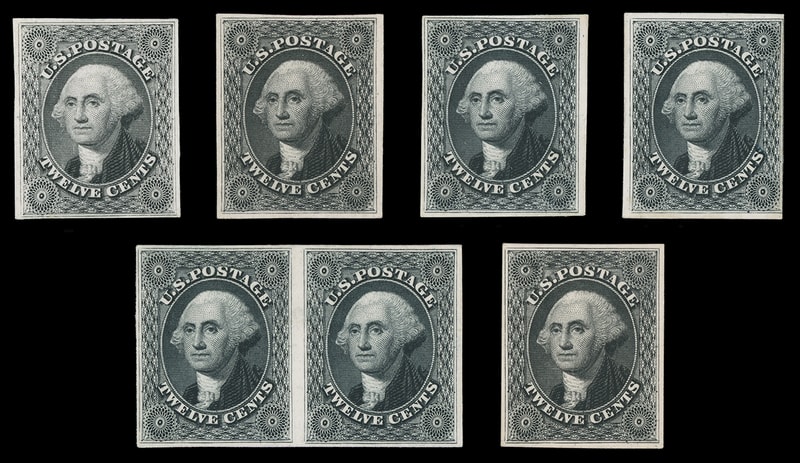 1857-60 (1875 Reprint), 12¢ greenish black, plate proofs on card, group of 4 singles and 1 pair from the card printings of 1879, 1885, 1885, 1885, 1890 with printing / thickness marked on back, nice margins, one clear at right, classed by print quality, color variation and card thickness to year date based on research, these are not all greenish black, and as such are unlisted in Scott (which is incomplete), Fine and rare assemblage.