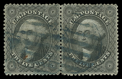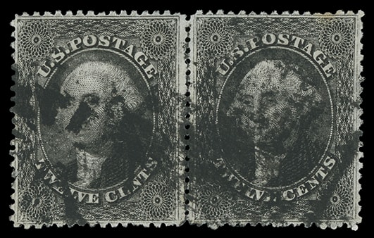1859, 12¢ black, plate III, horizontal pair, exeedingly well centered with wide margins, bit heavily canceled, Very Fine.