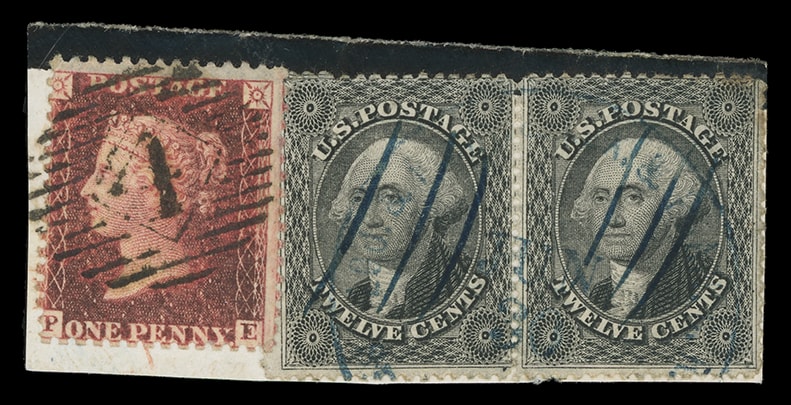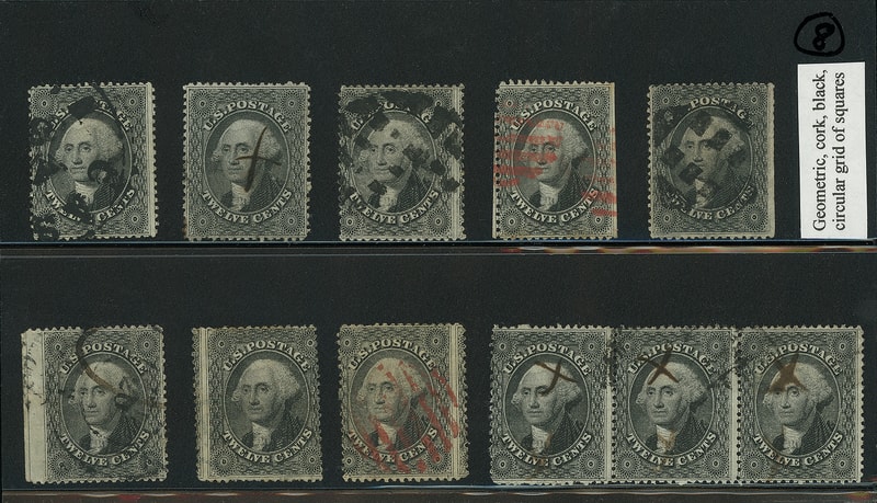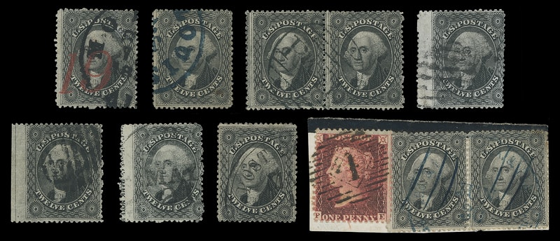 1857, 12¢ black, plate I, small group of six singles and two horizontal pairs, much of interest includes: red numeral "19"; blue cds; single with part imprint at left; pair with large Boston "Paid"; piece with ms. canceled pair used with GB 1p red, etc., small flaws, F.-V.F. and good group.