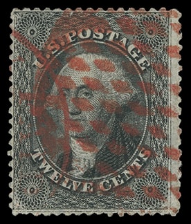1857, 12¢ black, plate I, nice centering with attractive red Hartford Ct. diamond grid cancel and partial cds, faults, striking F.-V.F. appearance.
