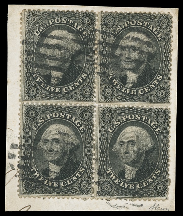 1857, 12¢ black, plate I, block of four, positions 34-35/44-45L1, nicely centered, intense shade and impression, tied by grid cancels on small piece of cover, Fine, with 2003 P.F. certificate, Fine and scarce used block from Plate 1; signed Alcuri, with 2003 P.F. certificate.