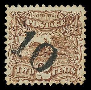 1869, 2¢ brown, well centered, bold numeral "10" cancel, light horizontal crease and ever so slight perf tip toning, Very Fine appearance and choice cancel.