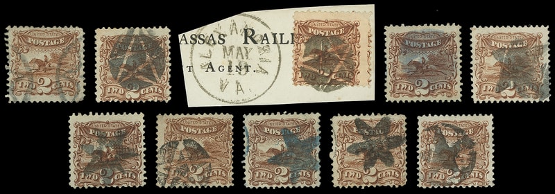 1869, 2¢ brown - Star Cancels, group of 10 singles, couple with exceptional centering, each with different star cancel, many complete or clear strikes, includes one NYFM, one blue strike, one on Alexandria Va. small piece, some minor flaws, F.-V.F.