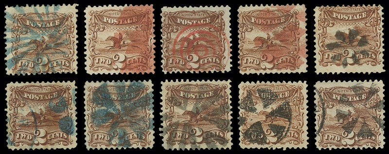 1869, 2¢ brown - fancy cancels, group of 10 singles, mostly with fancy geometric cancels including red (3) and blue (3) strikes; couple stamps with large and well balanced margins, some unobtrusive small flaws, F.-V.F. group with many attractive strikes.