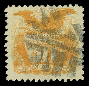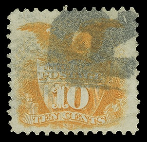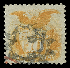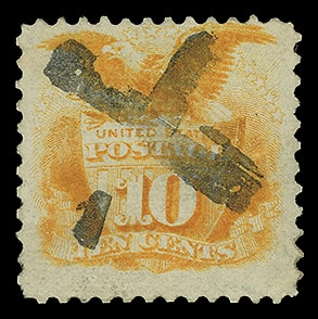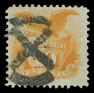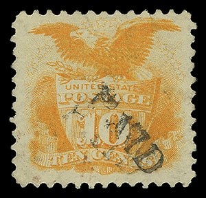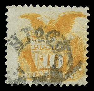 1869, 10¢ yellow, fresh and well centered for issue, bold hourglass cancel, light internal crease and bends, F.-V.F., quite attractive and unusual.