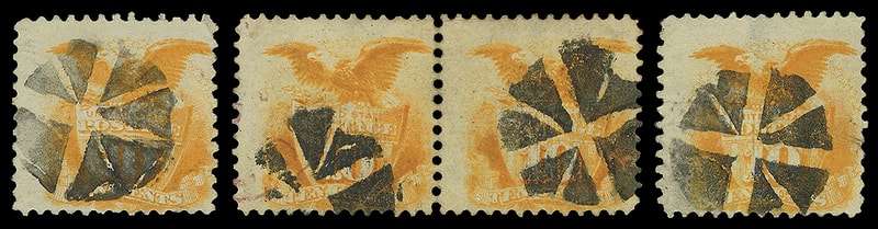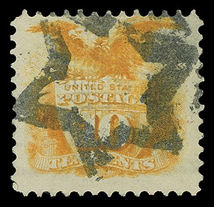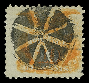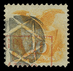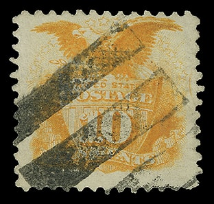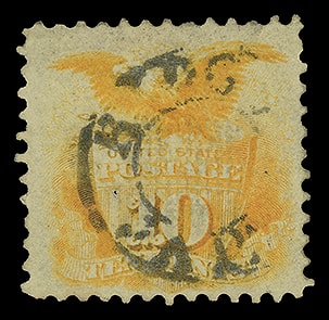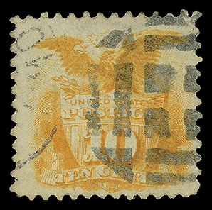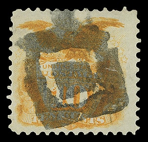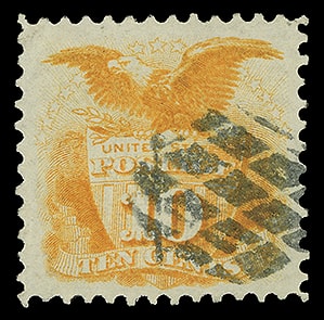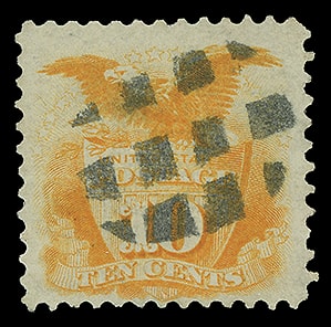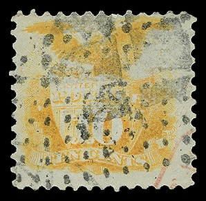1869, 10¢ yellow, well centered single, heavy double strike of segmented San Francisco square boxed canel, exceptionally well centered within large margins, rich vibrant color, bold double-strike of San Francisco geometric, Extremely Fine and choice.