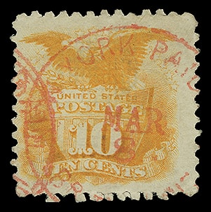 1869, 10¢ yellow, bright color with decent centering, red "New York, Paid All, Br. Packet" exchange cds cancel, some irregular perfs at bottom, F.-V.F. and attractive.