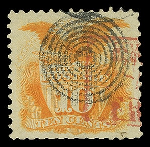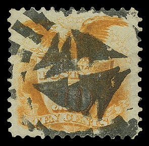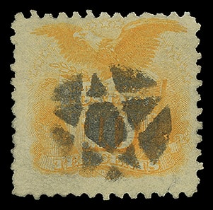 1869, 10¢ yellow, nicely centered and fresh, bold fancy geometric (Skinner-Eno GE-C 195) of Springfield Mo. and bit of red exchange cds at lower left, Very Fine and unusual geometric fancy cancel, ex-Koppersmith ; with 1989 P.F. certificate as geometric.