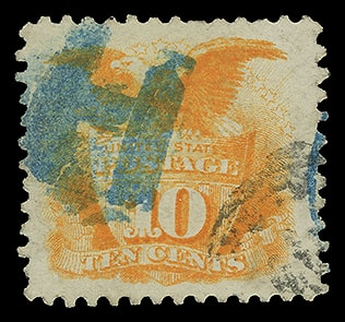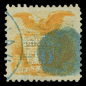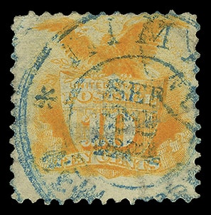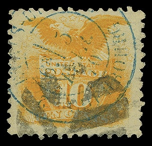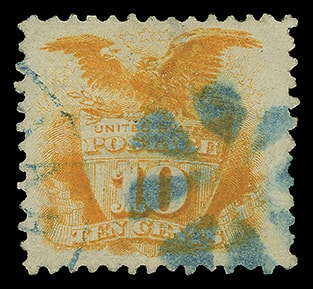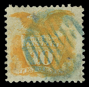 1869, 10¢ yellow, exceedingly well centered with fresh color, pretty blue circle of wedges fancy cancel duplexed with partial Savannah Ga. cds, tiny thin at top, Extremely Fine appearance.