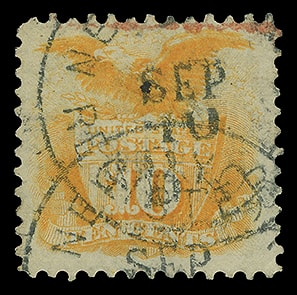 1869, 10¢ yellow, exceedingly well centered within large balanced margins, pretty blue Savannah, Ga. duplex with bold cork cancel, Extremely Fine and attractive.