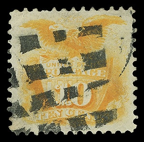 1869, 10¢ yellow, remarkably well centered with even margins, bold square grid of squares fancy cancel, shorter perf at top, Extremely Fine.