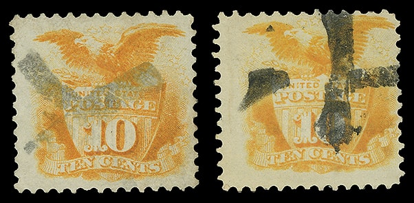 1869, 10¢ yellow, two fresh singles, one very well centered other typically centered, each with partial Nagasaki Japan "Cross" cancel, F.-V.F. and scarce.