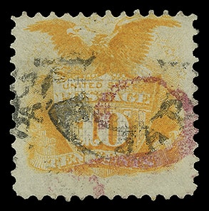 1869, 10¢ yellow, centered to top, fresh color, partial " Hiogo, Japan " double-circle cancel and rare magenta large " 2 " of San Francisco, F.-V.F. and rare cancel combination.