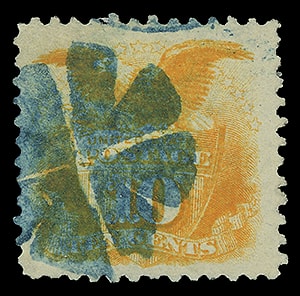 1869, 10¢ yellow, nicely centered, attractive blue circular grid cancel, pinhole, pretty and Very Fine appearance.