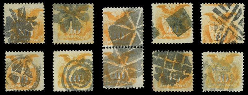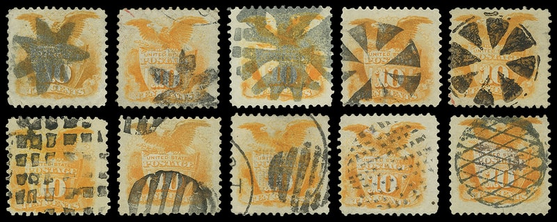 1869, 10¢ yellow - Fancy Cancels, group of 10 singles, all fresh and with better than usual centering, each with fancy or unusual cancel including stars, radials, circle of wedges and various grids, some small flaws, F.-V.F. or better, wonderful group of interesting cancels on attractive stamps.