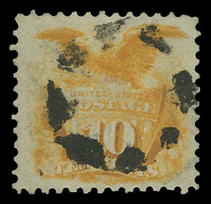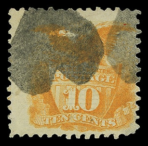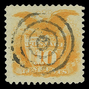 1869, 10¢ yellow, exceedingly well centered, rich color, unusual target fancy cancel, light margin crease, Extremely Fine appearance.