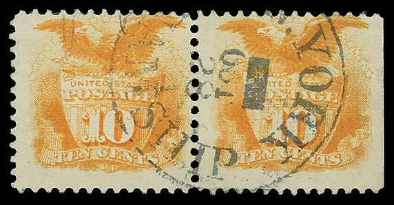 1869, 10¢ yellow, horizontal pair with natural s.e. at right, vibrant color, well-struck "N. York Steamship, Oct 28" cds, right stamp creased, fresh and F.-V.F.