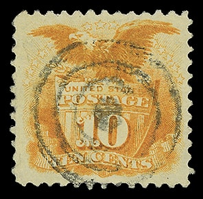 1869, 10¢ yellow, well centered, bright color, unusual segmented circular cancel, Very Fine.