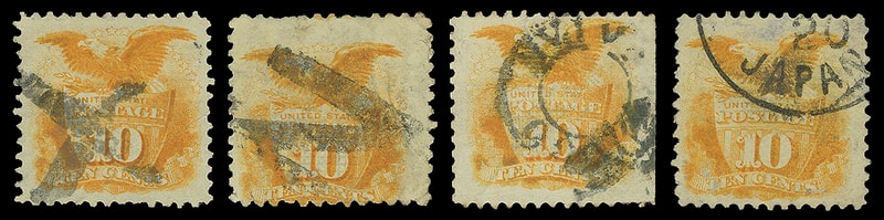 1869, 10¢ yellow, group of four singles, each with Japan cancels comprising: Nagasaki cross, rare Nagasaski "N", "Hiogo, Japan" double-circle, partial Yokahama Japan cds, stamps fresh, one with natural straightedge, small flaws including one with diagonal crease splitting paper, with small edge tear, F.-V.F. and impression group of these scarce Japan cancels.
