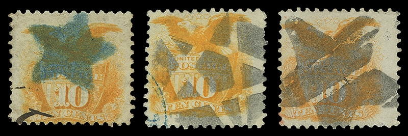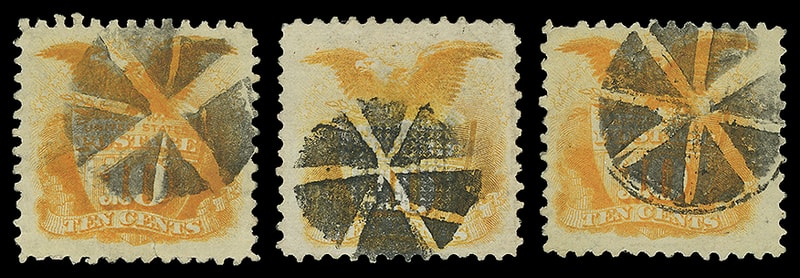 1869, 10¢ yellow, group of three with different bold star cancels, one in blue, one incised, small flaws, F.-V.F. trio with choice strikes.